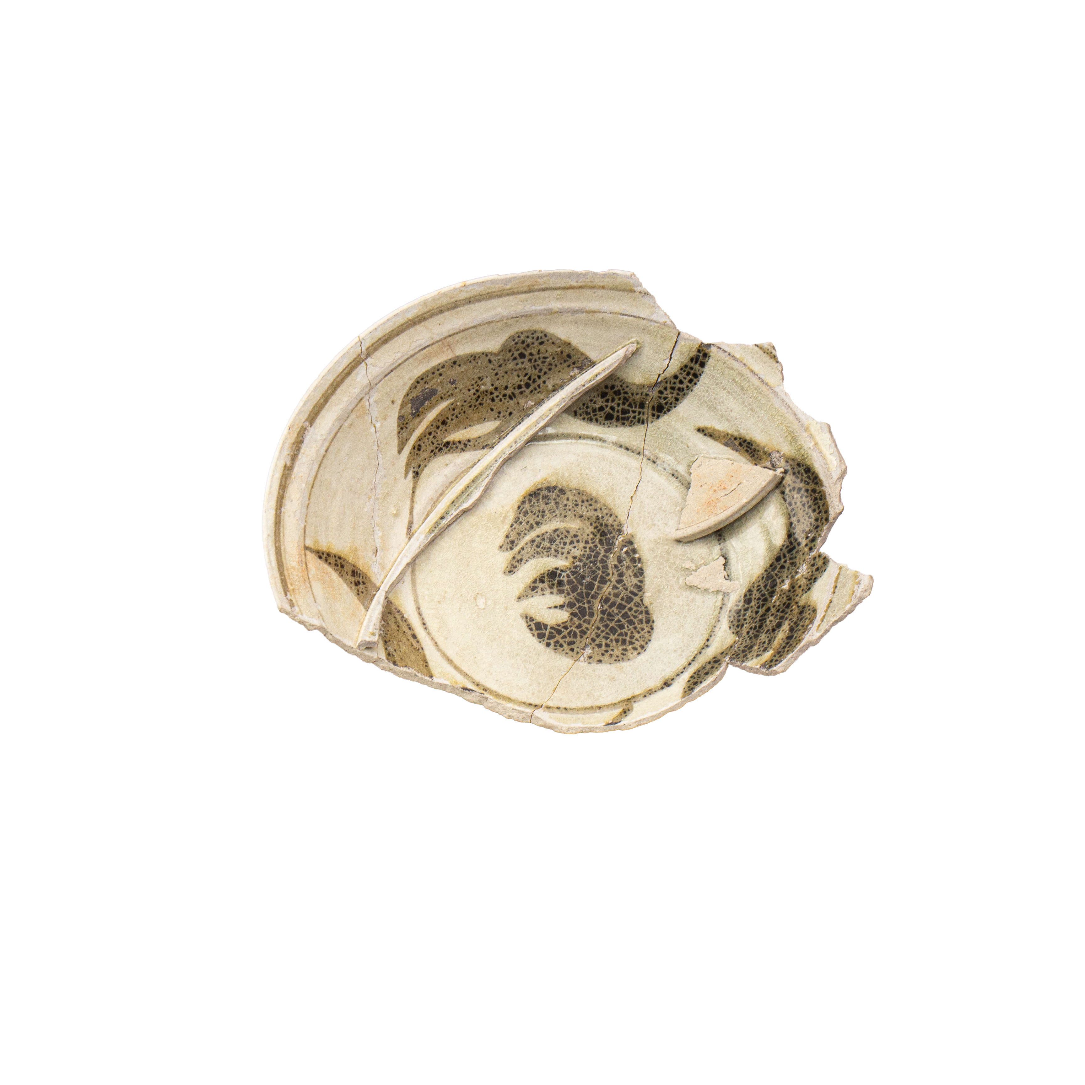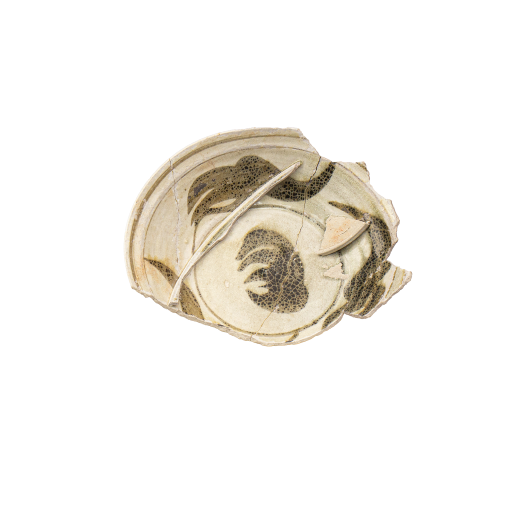 | ลักษณะวัตถุ | จาน/ชามเนื้อบาง ปากผาย (ประมาณ 1.15 ซม.) ชนิดเขียนลายใต้เคลือบสีดำ น้ำเคลือบหนา เรียบ และแตกรานทั่วทั้งชิ้น ภายในมีชิ้นส่วนจากภาชนะอื่นติดอยู่ |