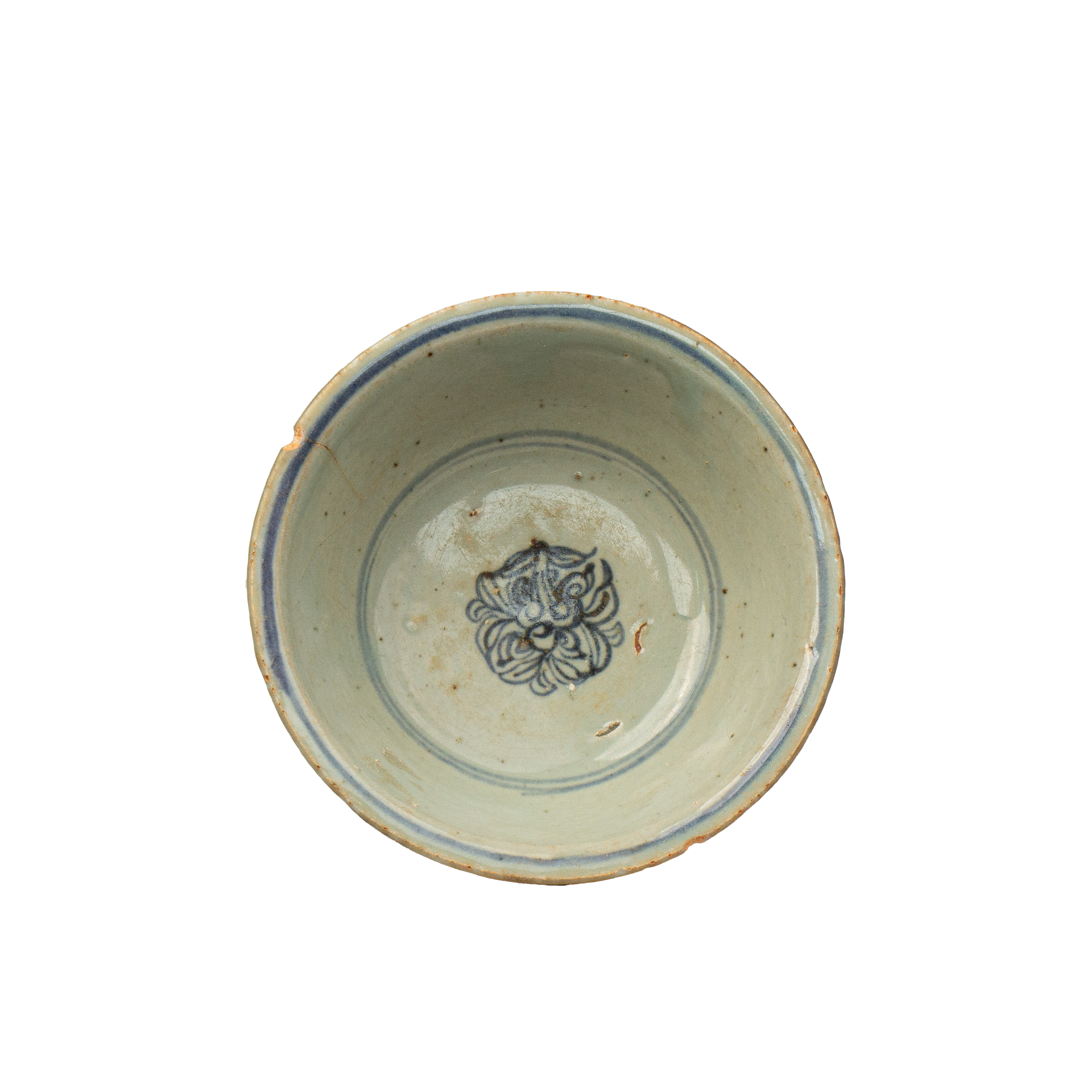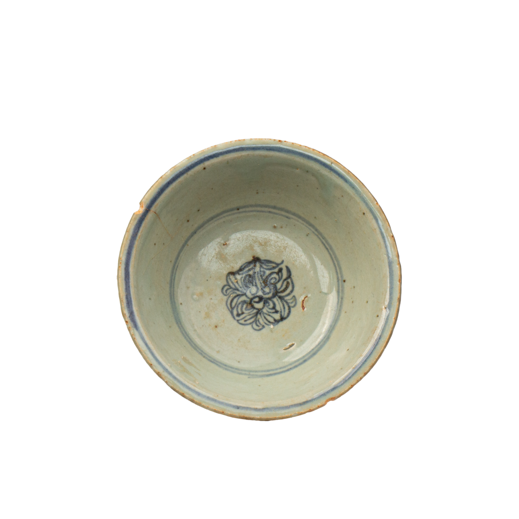 | ลักษณะวัตถุ | ถ้วย เนื้อบาง ขอบปากผายเล็กน้อย ชนิดเขียนลายใต้เคลือบสีน้ำเงิน น้ำเคลือบหนา แต่บางตอนเคลือบไม่ติด ขอบฐานภาชนะด้านนอกไม่เคลือบ |