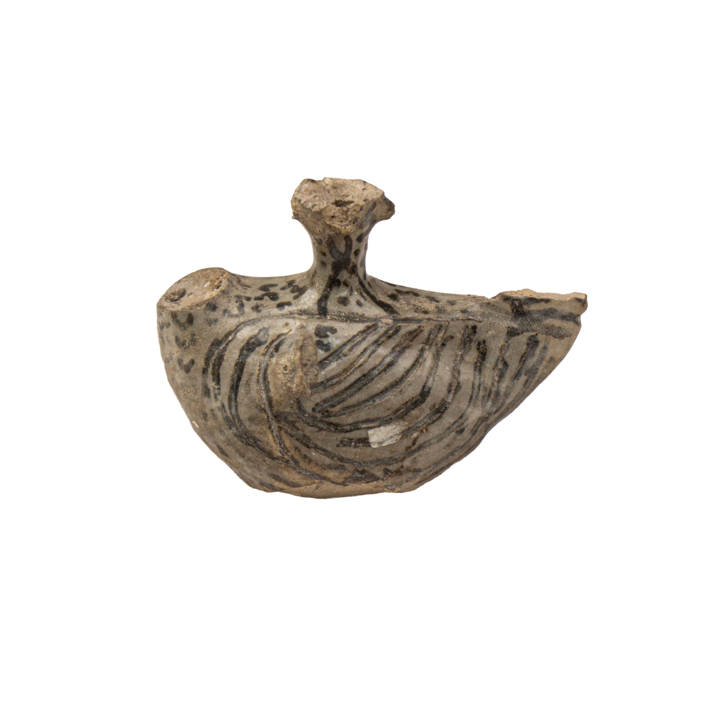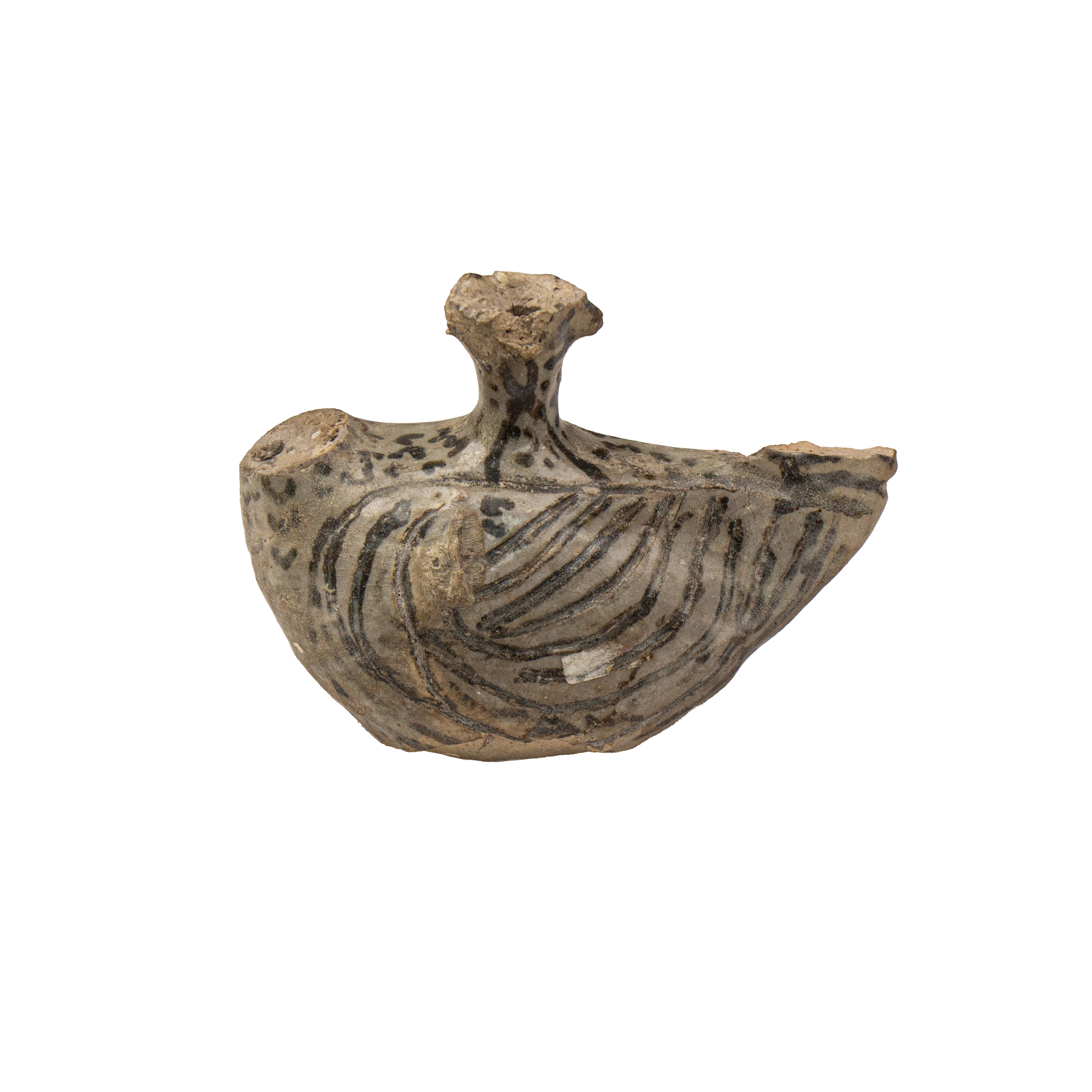 | ลักษณะวัตถุ | ชิ้นส่วนของรูปตัวสัตว์รูปนก อาจเป็นของเล่นหรือของเซ่นไหว้ ชนิดเขียนลายใต้เคลือบสีดำ ลวดลายที่เขียนเป็นลายของปีกและขนนก น้ำเคลือบแตกราน ส่วนคอและหางหัก |